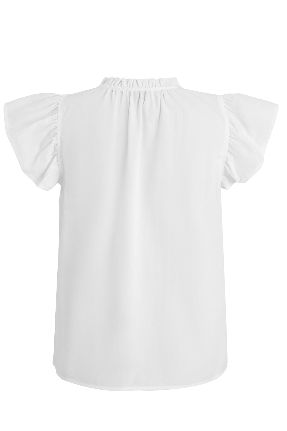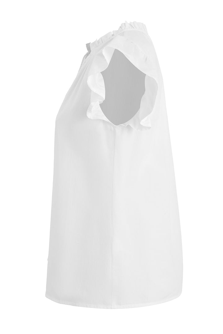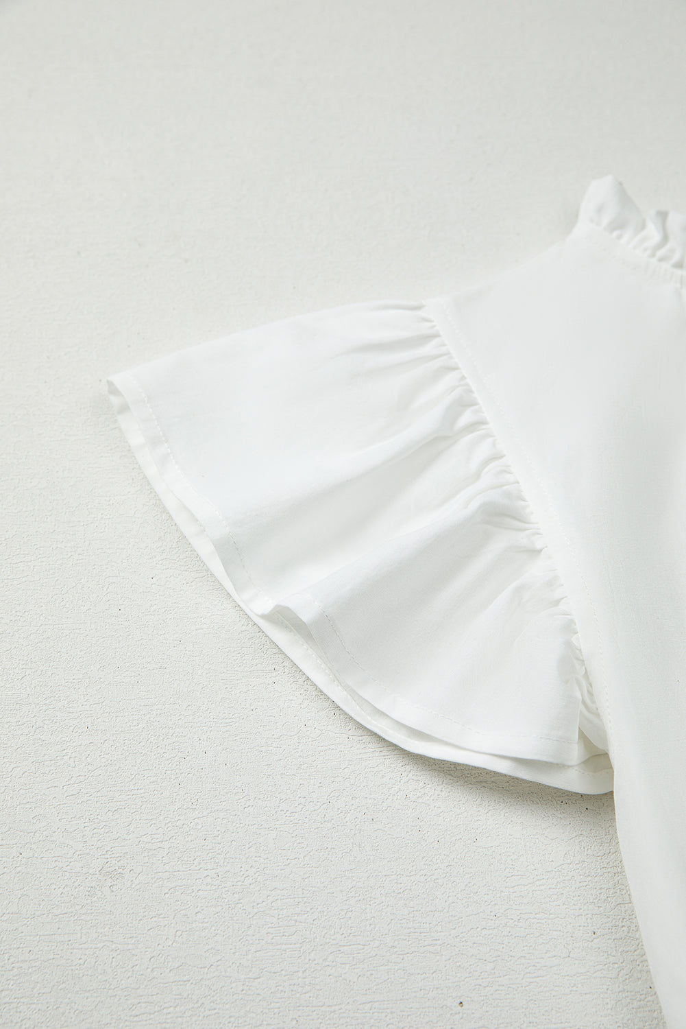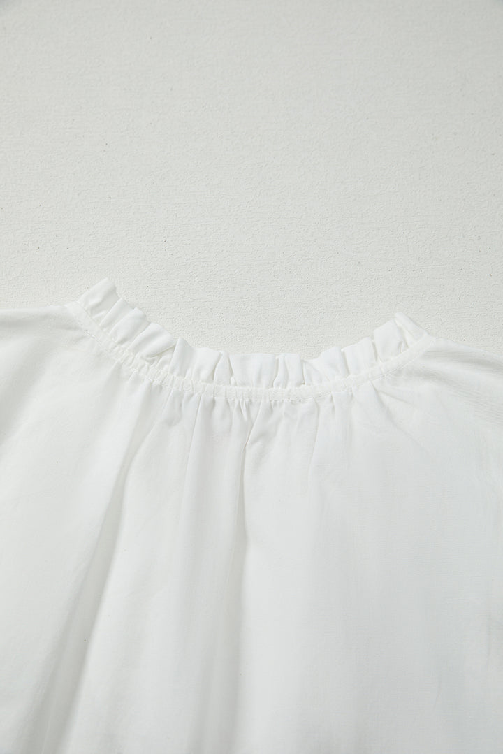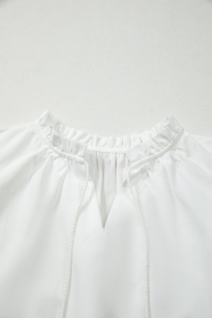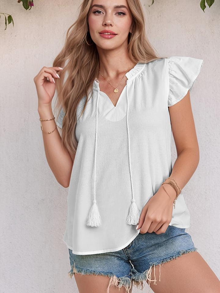 Tassel Tie Split Neck Frilly Ruffle Trim Short Sleeve Blouse