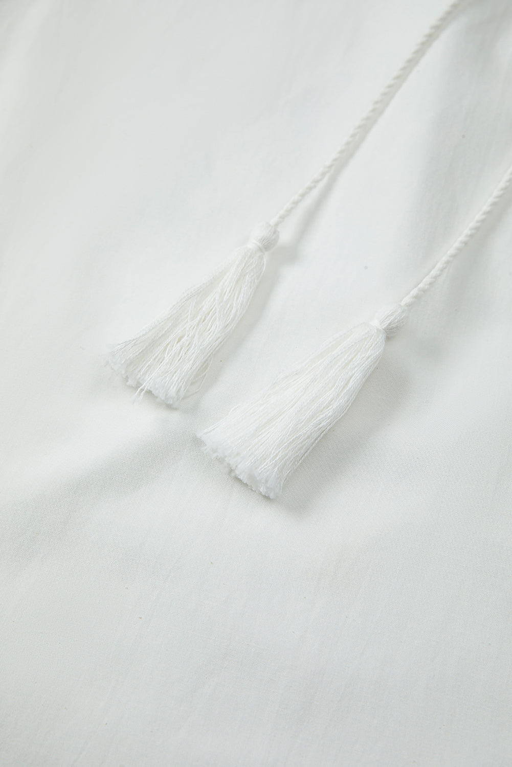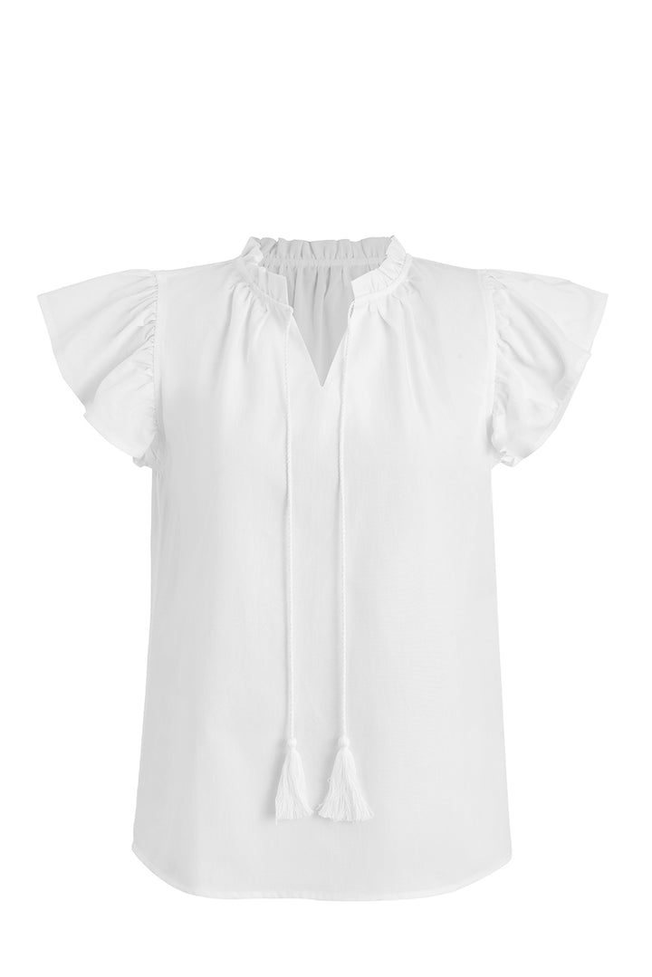 It features a split neck with tassel tie detail, frilly ruffled sleeves and loose fit style.