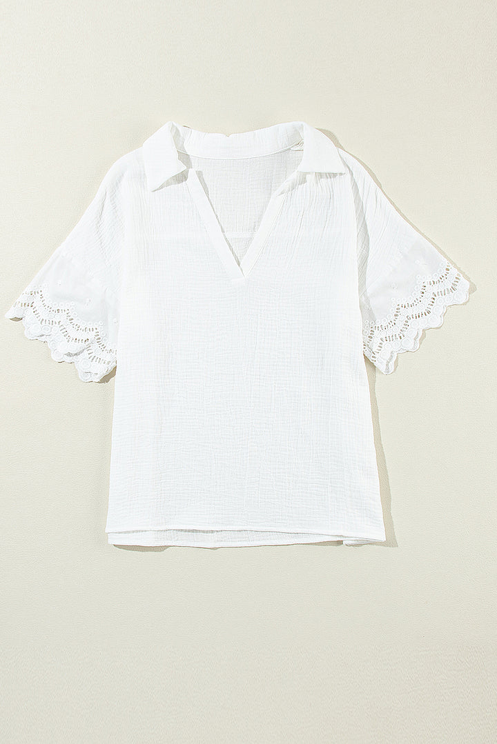Increase quantity for V Neck Crinkled Lace Splicing Sleeve Collared Blouse