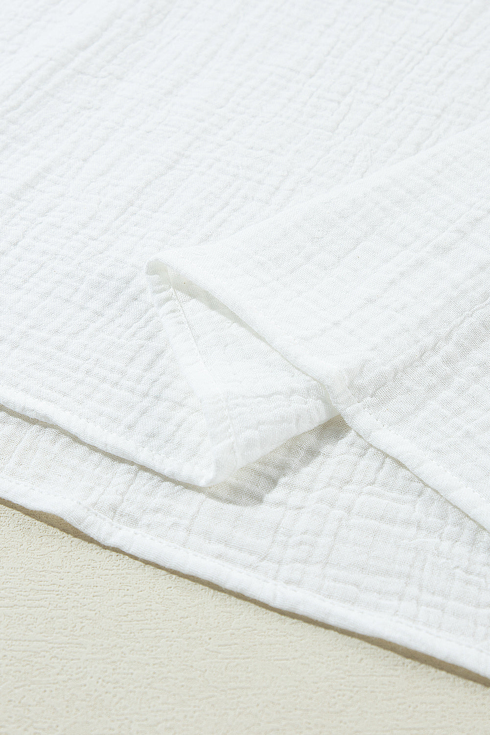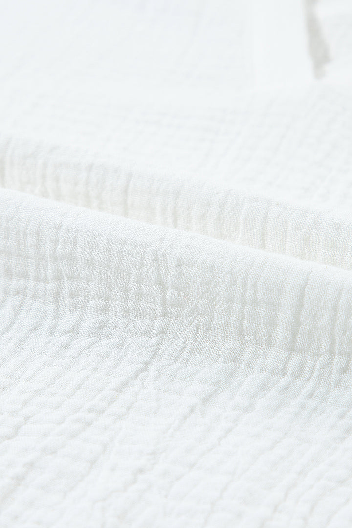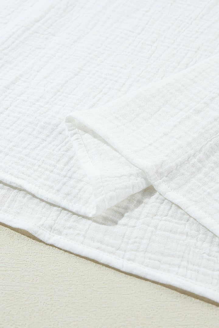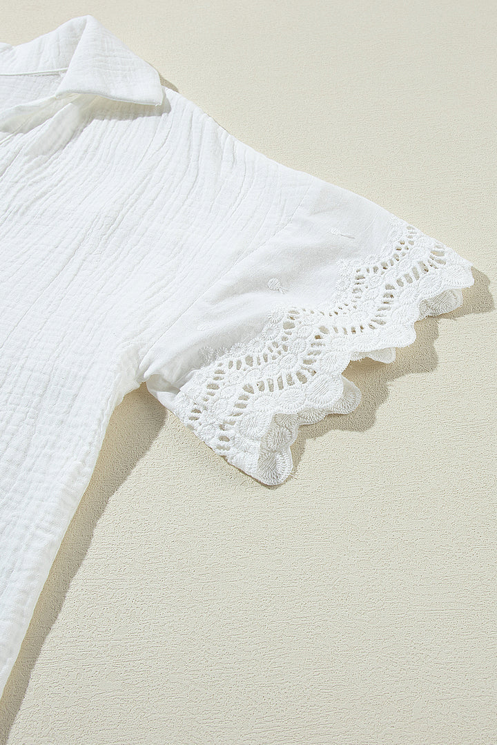 Effortlessly elegant, this solid-colored blouse is a study in texture and detail. A traditional collar frames the neckline, delicate lace offers a subtle contrast, and the crinkled fabric ensures a beautifully dimensional drape.