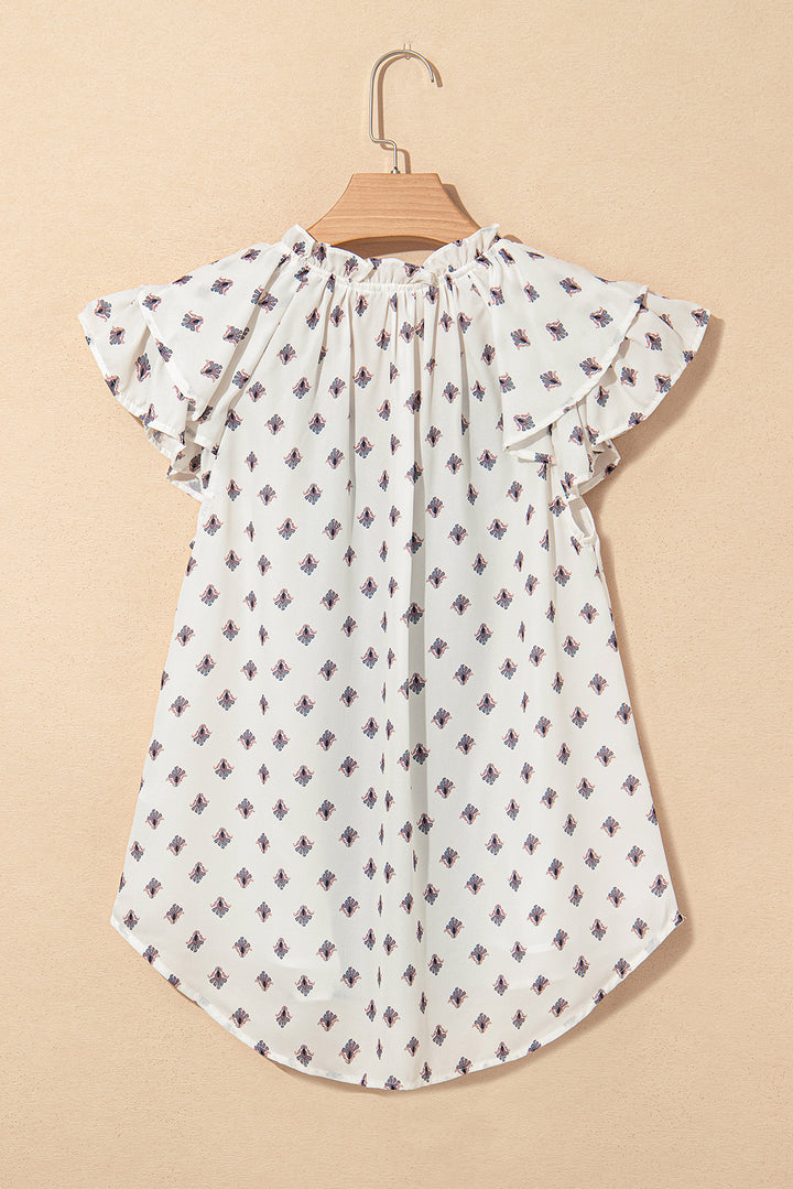 White Boho Pattern Tiered Ruffled Sleeve V Neck Buttoned Blouse