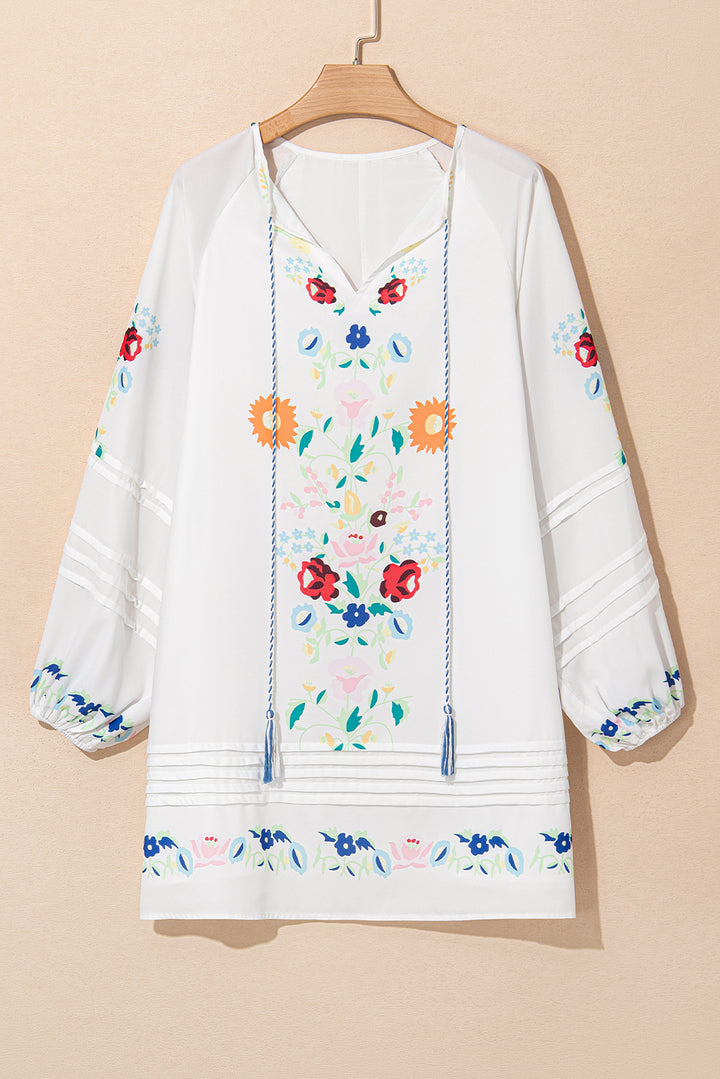 White Floral Print Boho Tassel Tie Split Neck Tucking Detail Puff Sleeve Mini Dress