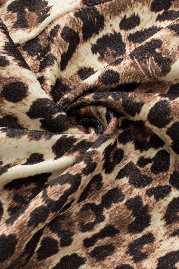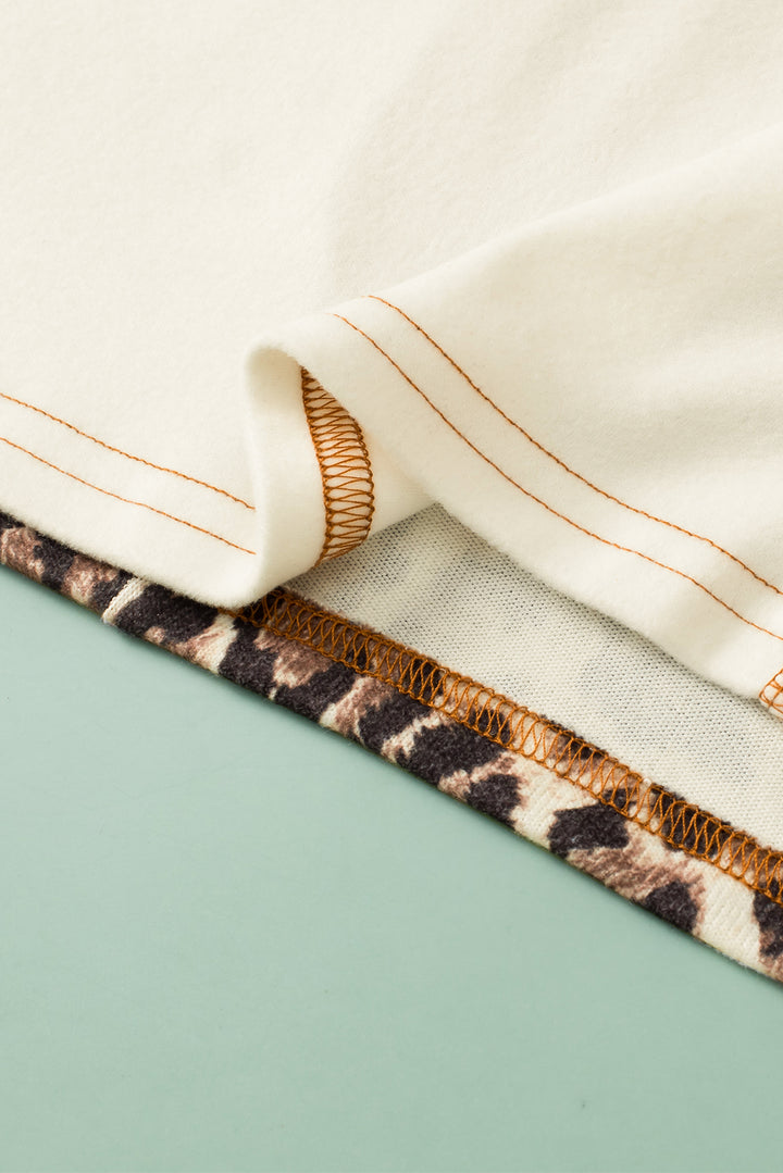 White Leopard Color Block Patchwork Split Neck Long Sleeve Top
