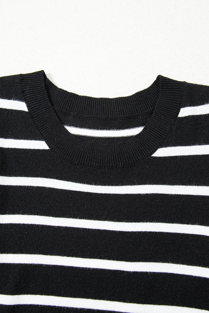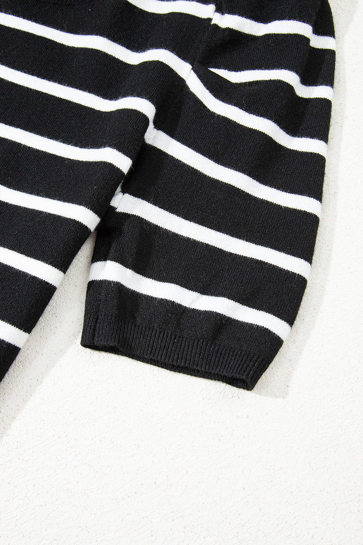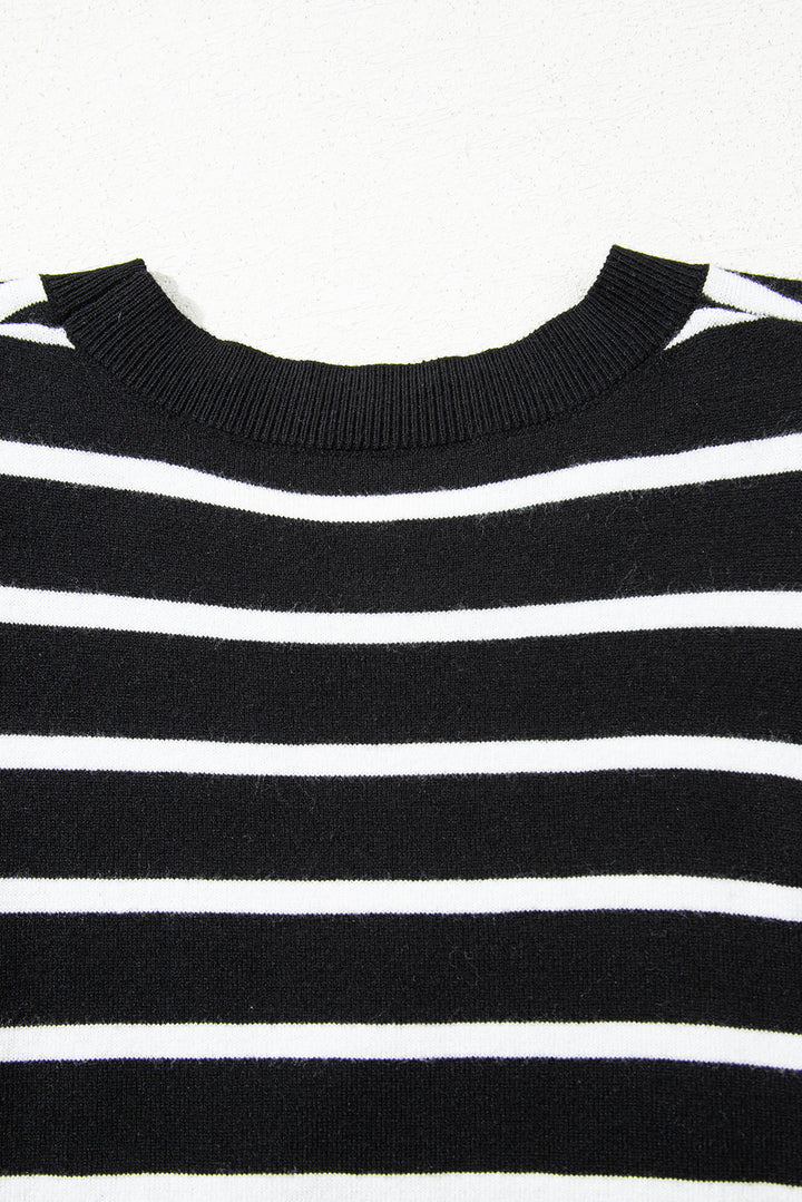 White Stripe Ribbed Trim Round Neck Bubble Sleeve Knitted Top