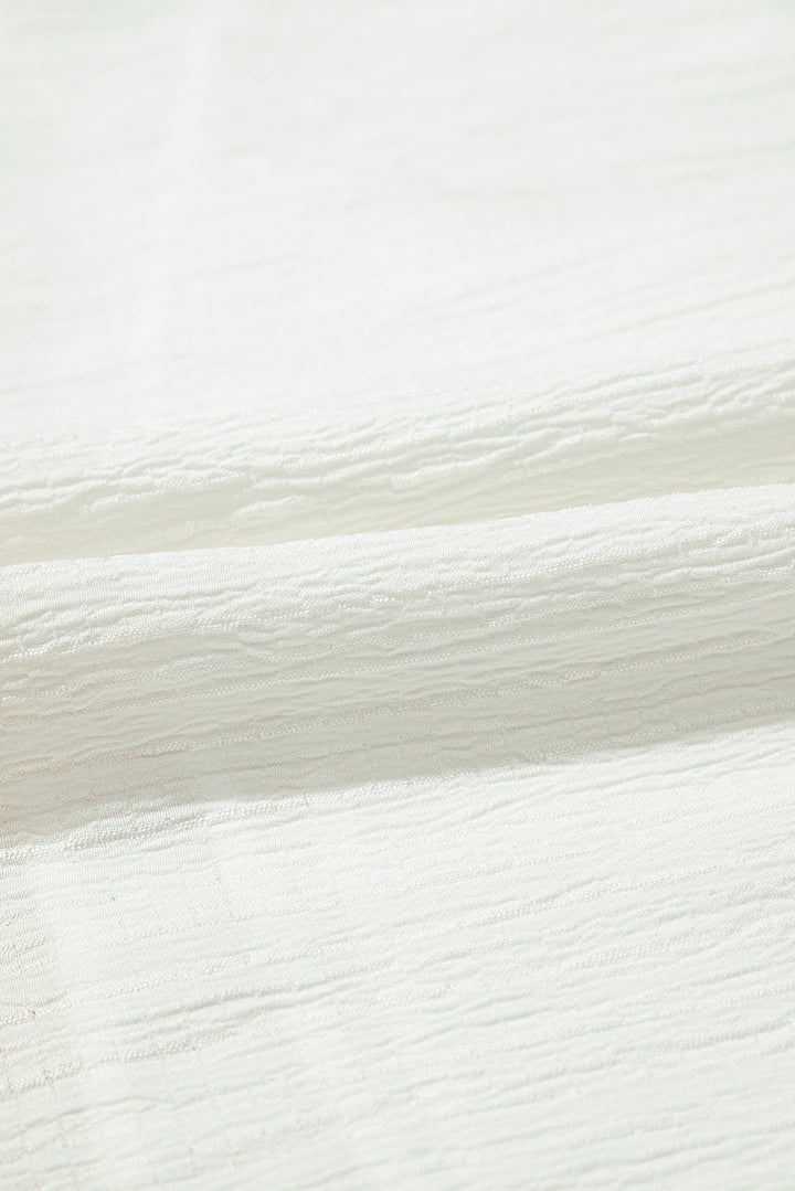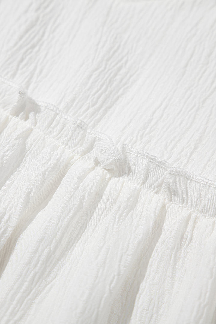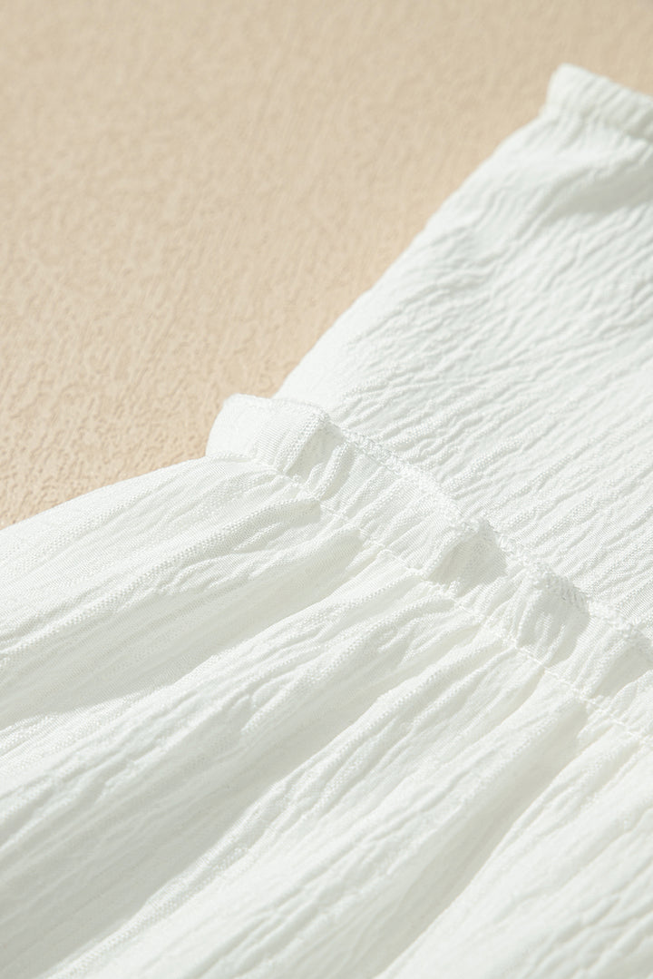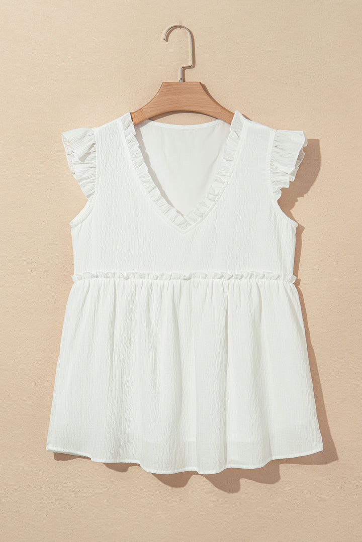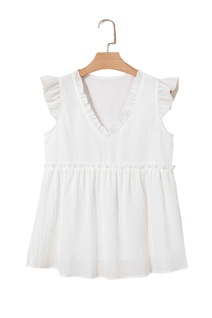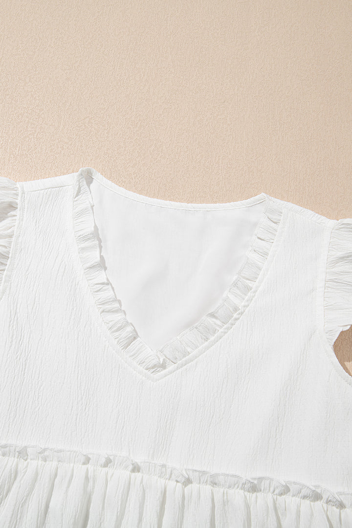 White Textured Ruffled Trim V Neck Flutter Flowy Top
