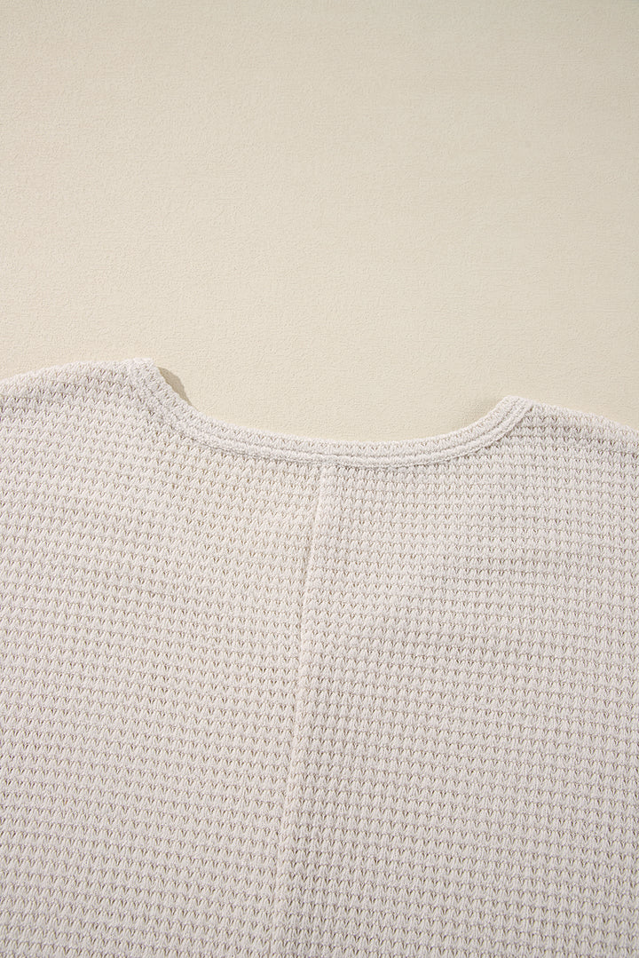 White Waffle Knit Side Slits Loose Fit V Neck Top